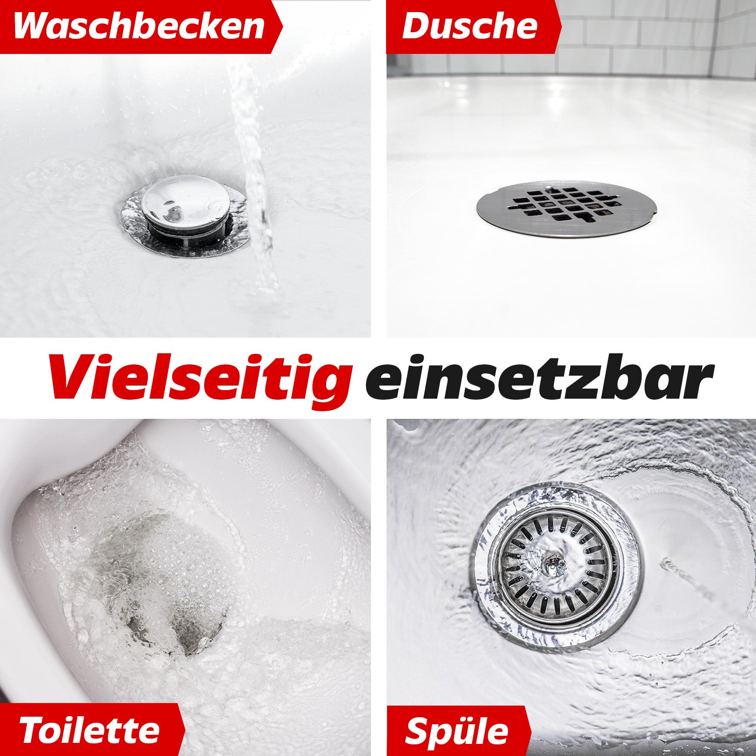 - ✅ EXTRA STARK GEGEN HAARE - Unser Rohrreiniger löst selbst Haare, Essensreste, Seifenreste, Fette und andere schwerste Verstopfungen effektiv auf. - Zur Rohrreinigung von Rohren und Abflüssen aller Art, wie Edelstahl, Kunststoffrohre, Ton oder Eisen. Zur Anwendung in Bad, Badewanne, Dusche, Duschabfluss, Küche, Spüle, WC / Klo / Toilette, Siphon, Waschbecken oder Gastro.